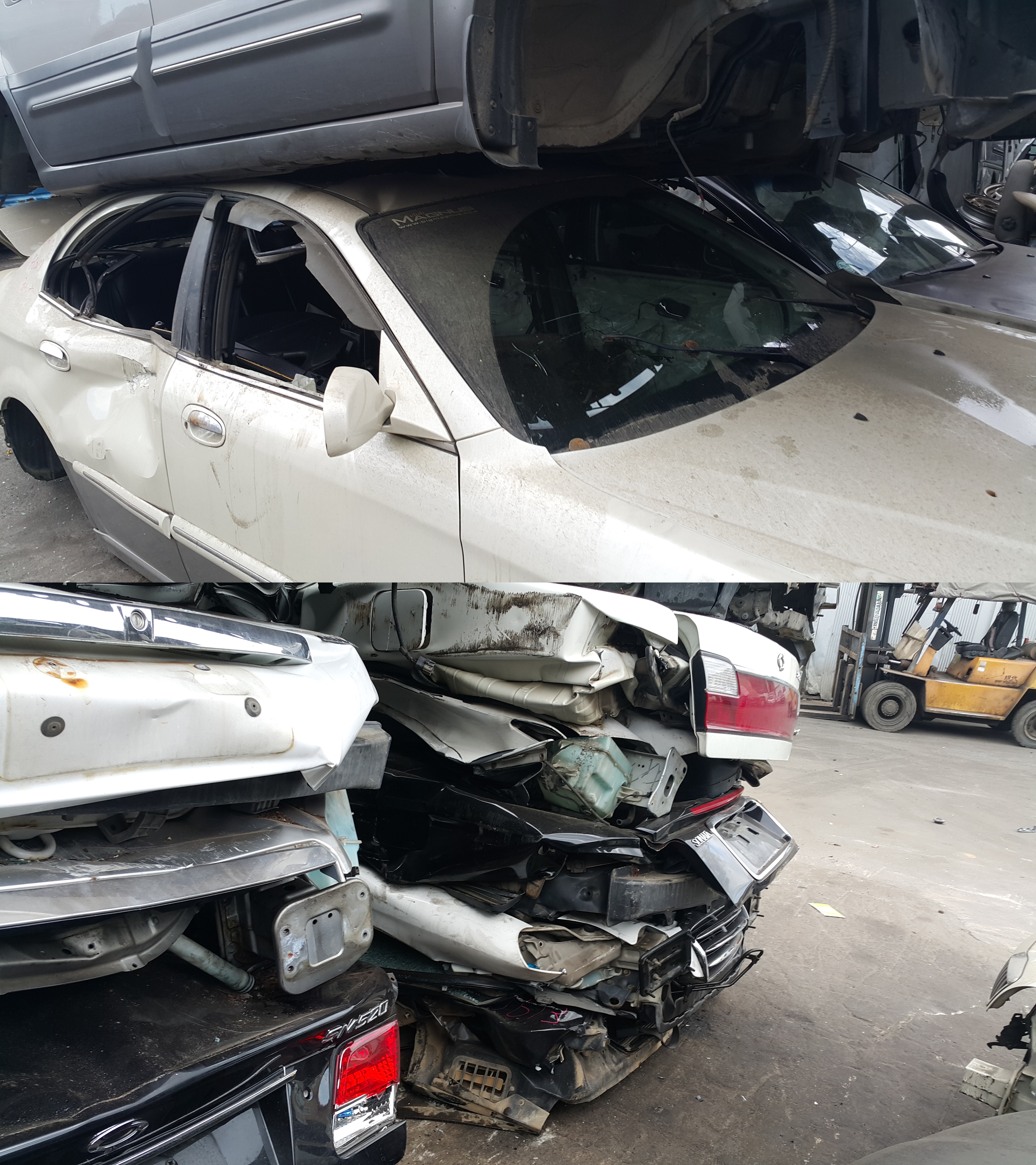 차량 해체 전담 직원은 번호판 분리 후, 재활용할 수 있는 부품, 특수금속, 엔진 등을 추출합니다. 그리고 해체하고 남은 아벨라 차량은 압축하는 장비로 누르게 됩니다.